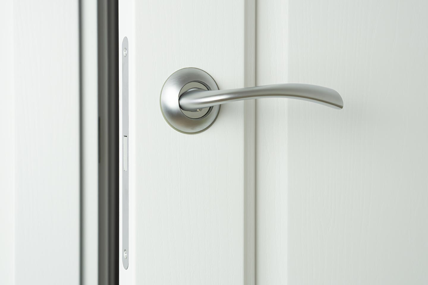 Nahaufnahme einer weißen Tür mit silbernem Türdrücker und Schlüsselloch